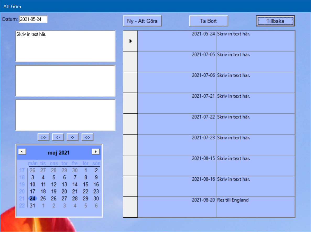 Här kan du lägga in det som du behöver komma ihåg och dina avtalade möten. Enkelt och otroligt effektivt.