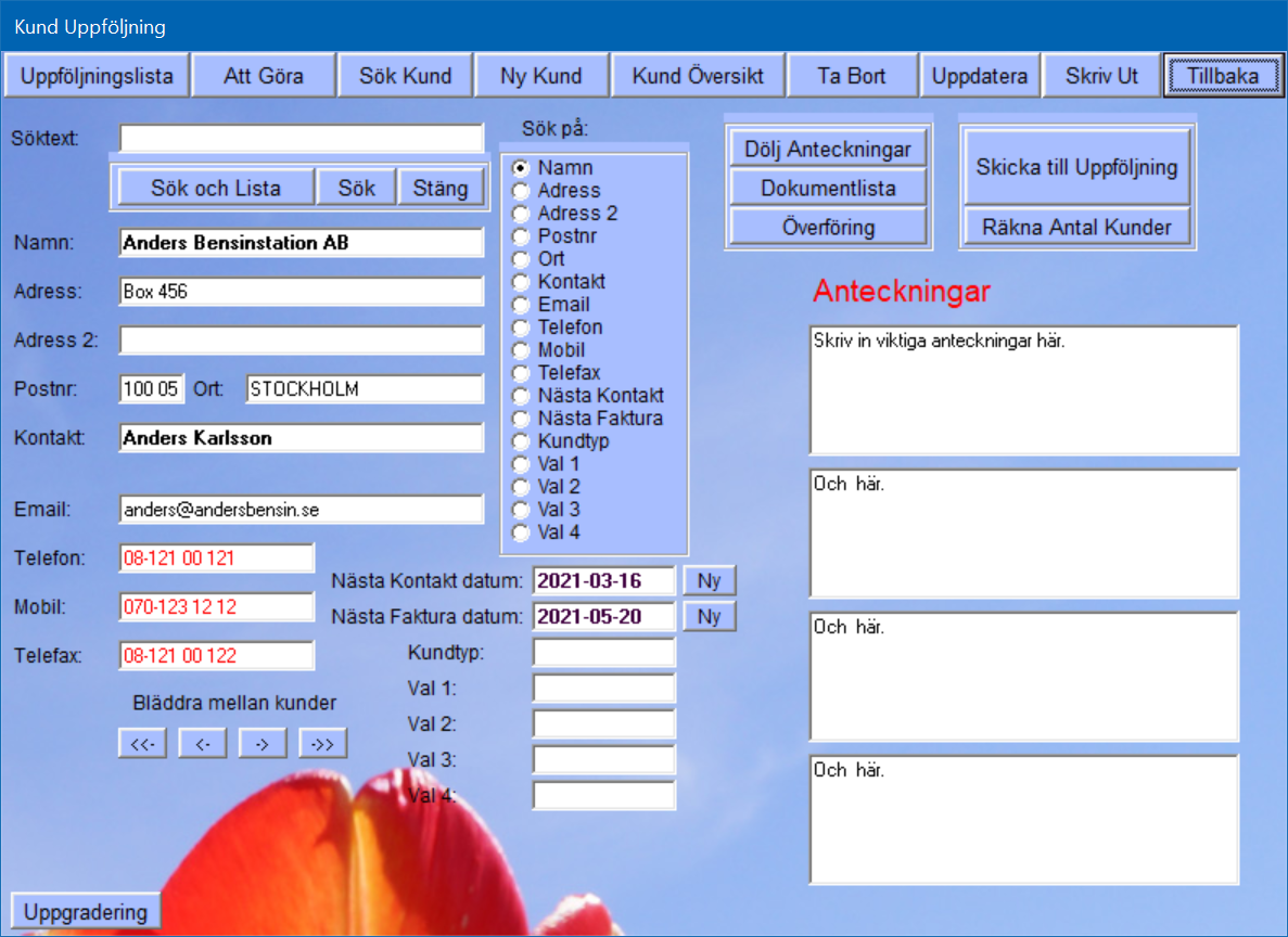 Kund Uppföljning håller ordning på adresser, telefonnummer och annan viktig information om dina kunder. Med ett par knapptryck hittar du den information du önskar, oavsett om det är ett telefonnummer eller en anteckning från det sista samtalet med kunden. Lika lätt är det att ändra eller ta bort information.