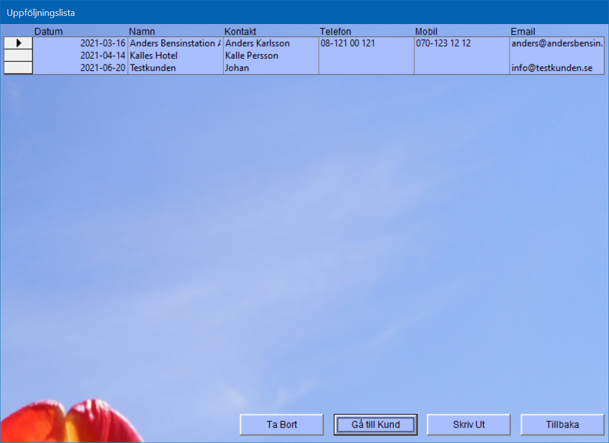 Uppföljningslistan visar vilka du ska kontakta och när. Med ett klick kommer du direkt till kunden för att se mer information.