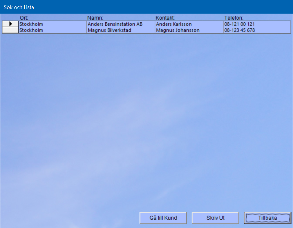 Här ser du resultatet av ett sök på ”Ort” Stockholm med Sök och Lista. Du kan därefter enkelt skriva ut eller gå direkt till en kund.