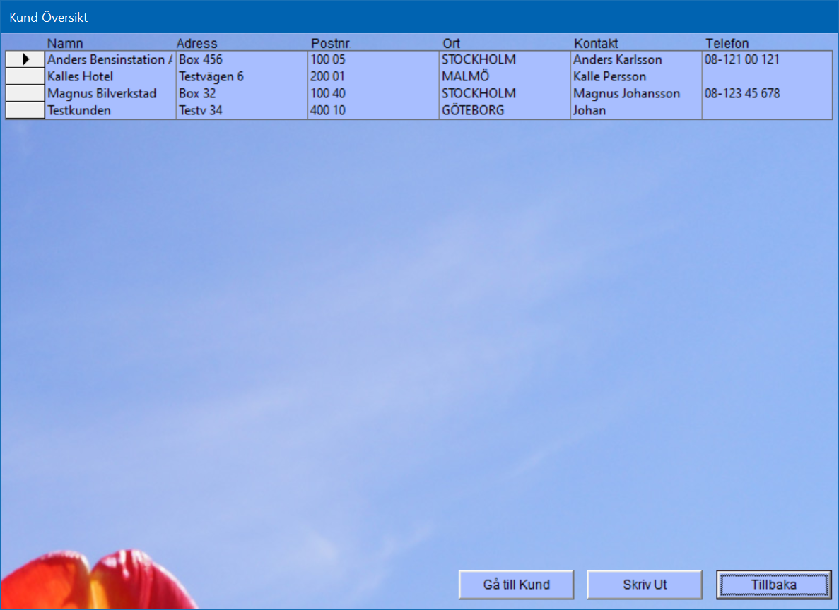 Här får du en översiktsbild över kunderna som ligger i systemet. Du kan skriva ut listan, eller gå till en kund.